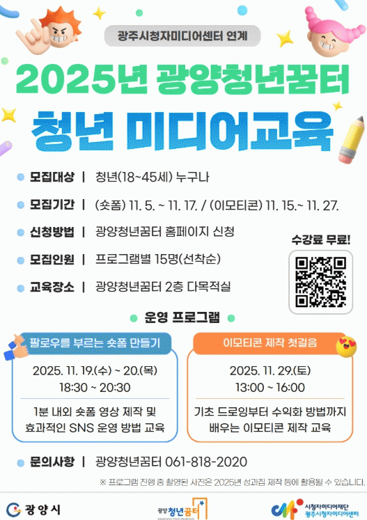 ¼ö° ½ÅûÀº ±¤¾çû³â²ÞÅÍ ´©¸®Áý(ȨÆäÀÌÁö)¿¡¼ ¼±Âø¼øÀ¸·Î Á¢¼öÇÑ´Ù. ½Åû ±â°£Àº ¡ã¡®ÆÈ·Î¿ì¸¦ ºÎ¸£´Â ¼ôÆû ¸¸µé±â¡¯´Â 11¿ù 5ÀϺÎÅÍ 17ÀϱîÁö, ¡ã¡®À̸ðƼÄÜ Á¦ÀÛ Ã¹°ÉÀ½¡¯Àº 11¿ù 15ÀϺÎÅÍ 27ÀϱîÁö´Ù.