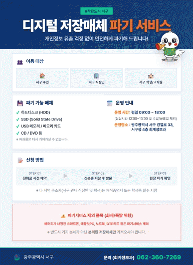 ¼ºñ½º ÀÌ¿ë ´ë»óÀº Áֹεî·Ï»ó ÁÖ¼ÒÁö°¡ ¼±¸ÀÎ ÁֹλӸ¸ ¾Æ´Ï¶ó ¼±¸ ¼ÒÀç ȸ»ç¡¤Çб³ µî¿¡ ´Ù´Ï´Â »ýȰ±ÇÀÚµµ Æ÷ÇԵȴÙ. ¼ºñ½º¸¦ Èñ¸ÁÇÏ´Â °æ¿ì ¼±¸Ã» ȸ°èÁ¤º¸°ú(062-360-7269)·Î ÀüÈÇØ »çÀü ¿¹¾à ÈÄ ¹æ¹®ÇÏ¸é µÈ´Ù. ´Ü ¹èÅ͸®°¡ ³»ÀåµÈ µðÁöÅÐ ±â±â(½º¸¶Æ®Æù, ÅÂºí¸´PC, ³ëÆ®ºÏ µî)´Â ÈÀç¡¤Æø¹ß À§ÇèÀ¸·Î ÀÎÇØ ÆÄ±â ´ë»ó¿¡¼ Á¦¿ÜµÇ¸ç ÀúÀå¸Åü¸¸ ºÐ¸®ÇØ °¡Á®¿Í¾ß ÇÑ´Ù.