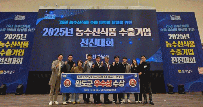 ÇÑÆí °°Àº ³¯ ¿¸° 'Àü³² ³ó¸²Ãà»ê¹° ¼öÃâž ½Ã»ó½Ä'¿¡¼ ¿Ïµµ±º ¼öÃâ ¾÷üÀÎ ¢ß¹Ù´Ù¸í°¡(500¸¸ ´Þ·¯), ÇØ¹Ì¿ø ¿µ¾îÁ¶ÇÕ¹ýÀÎ(100¸¸ ´Þ·¯), ¢ßǪ¸¥Á¤½Äǰ(50¸¸ ´Þ·¯), ¿Ïµµ¹Ù´Ù ¿µ¾îÁ¶ÇÕ¹ýÀÎ(20¸¸ ´Þ·¯)Àº ¼öÃâžÀ» ¼ö»óÇϸç Áö¿ª ¼ö»ê¹° ¼öÃâ¿¡ ±â¿©ÇÑ °ø·Î¸¦ ÀÎÁ¤¹Þ¾Ò´Ù.