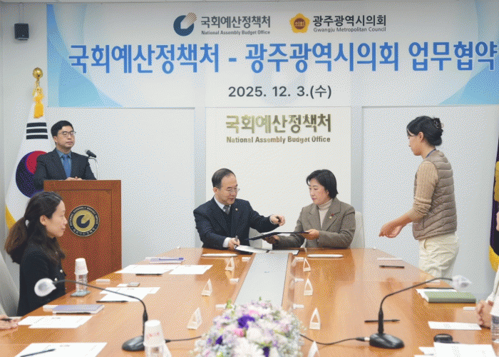 Áöµ¿ÇÏ ±¹È¸¿¹»êÁ¤Ã¥Ã³ÀåÀº ¡°±¹È¸¿¹»êÁ¤Ã¥Ã³´Â ±¹È¸ÀÇ ¿¹»ê½É»ç¸¦ Áö¿øÇÏ´Â ±¹°¡±Þ Àü¹®±â°üÀ¸·Î¼, Áö¹æÀÇȸ¿ÍÀÇ Çù·ÂÀÌ ±¹°¡¡¤Áö¹æ ÀçÁ¤ Àü¹ÝÀÇ Åõ¸í¼º°ú È¿À²¼ºÀ» ³ôÀÌ´Â µ¥ ±â¿©ÇÒ °Í¡±À̶ó¸ç ¡°±¤ÁÖ½ÃÀÇȸ¿ÍÀÇ À̹ø Çù¾àÀ» ÅëÇØ Áö¹æ ÀçÁ¤ºÐ¼® ¿ª·® °È¿¡ Àû±Ø Çù·ÂÇϰڴ١±°í È´äÇß´Ù.