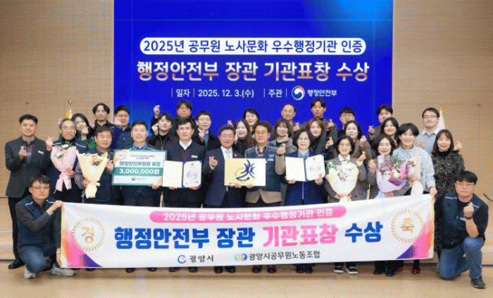 À̹ø ÀÎÁõÀ» ÅëÇØ ±¤¾ç½Ã¿Í ±¤¾ç½Ã°ø¹«¿ø³ëµ¿Á¶ÇÕÀº 2017³â, 2019³â, 2022³â¿¡ À̾î 2025³â±îÁö ³× Â÷·Ê ¿¬¼Ó ¿ì¼öÇàÁ¤±â°üÀ¸·Î ÀÎÁ¤¹ÞÀ¸¸ç, Çù·ÂÀûÀÌ°í ¾ÈÁ¤ÀûÀÎ ³ë»ç¹®È ±¸ÃàÀÇ ¸ð¹ü»ç·Ê·Î ±× À§»óÀ» ´õ¿í °ø°íÈ÷ Çß´Ù.