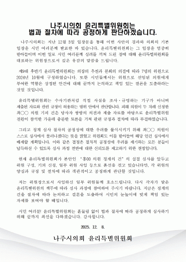 À±¸®Æ¯º°À§¿øÈ¸´Â ÀÔÀå¹®¿¡¼ ¡°³ªÁÖ½ÃÀÇȸ´Â Áö³ 12¿ù 5ÀÏ ÀÔÀå¹®À» ÅëÇØ À̹ø »ç¾ÈÀÇ °æ°ú¿Í ÀÇȸÀÇ ±âº» ÀÔÀåÀ» ½Ã¹Î ¿©·¯ºÐ²² ¹ßÇ¥ÇÑ ¹Ù ÀÖ´Ù¡±¸ç ¡°À±¸®Æ¯º°À§¿øÈ¸´Â ±× ÀÔÀåÀ» ¾öÁßÈ÷ ¹Þ¾ÆµéÀ̸ç, À̹ø ÀÏ·Î ½Ã¹Î ¿©·¯ºÐ²² ½É·Á¸¦ ³¢ÃÄ µå¸° Á¡¿¡ ´ëÇØ À±¸®Æ¯º°À§¿øÈ¸¸¦ ´ëÇ¥ÇÏ´Â À§¿øÀåÀ¸·Î¼ ±íÀº À¯°¨ÀÇ ¸»¾¸À» µå¸°´Ù¡±°í ÀüÇß´Ù.
