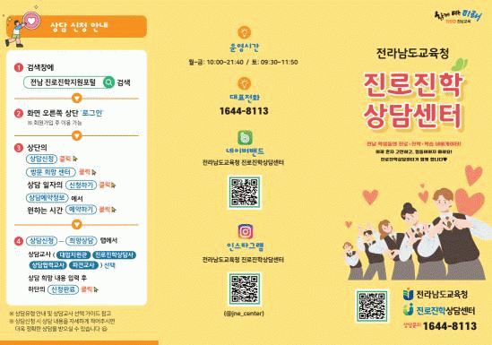 ÇÑÆí, Àü³²±³À°Ã» Áø·ÎÁøÇлó´ã¼¾ÅÍ´Â ¿¬Áß Áø·Î¡¤ÁøÇÐ »ó´ãÀ» ¿î¿µÇϸç, ¼ö½Ã¡¤Á¤½Ã ´ëºñ ÇÁ·Î±×·¥, ¸ðÀǸéÁ¢, Çкθð Áø·ÎÁøÇÐ ¾ÆÄ«µ¥¹Ì µî ´Ù¾çÇÑ Áø·ÎÁøÇÐ Áö¿ø Á¤Ã¥À» Áö¼Ó ÃßÁøÇϰí ÀÖ´Ù.