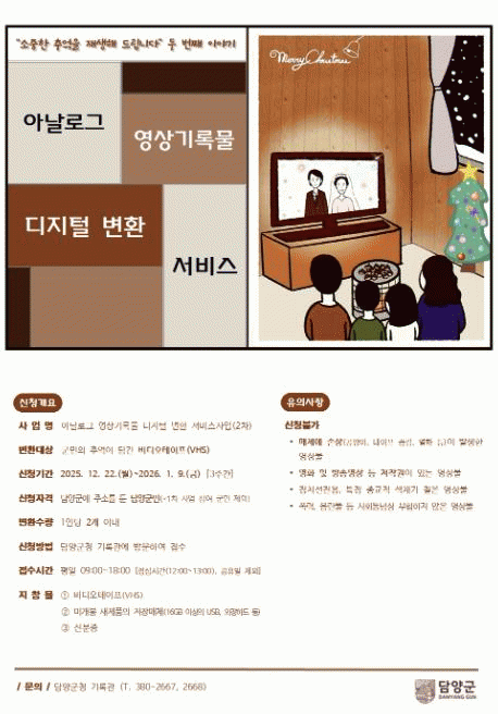 µðÁöÅÐ º¯È¯ ´ë»óÀº ºñµð¿ÀÅ×ÀÌÇÁ(VHS)·Î, 1Àδç ÃÖ´ë 2°³±îÁö ½ÅûÇÒ ¼ö ÀÖ´Ù. ½ÅûÀÚ´Â º¯È¯ÇÒ ºñµð¿ÀÅ×ÀÌÇÁ¿Í ¿ÜÀåÇϵå, À̵¿½Ä ÀúÀåÀåÄ¡(USB) µî ÀúÀå¸Åü, ½ÅºÐÁõÀ» ÁöÂüÇØ ´ã¾ç±ºÃ» ±â·Ï°ü(¹Ì·¡¼ºÀ嵿 2Ãþ)À» ¹æ¹®ÇÏ¸é µÈ´Ù. º¯È¯µÈ ¿µ»ó¹°ÀÇ ±âÁõÀ» Èñ¸ÁÇÒ °æ¿ì, ±â·Ï¹° »çº» Ȱ¿ë¿¡ ´ëÇÑ µ¿Àǰ¡ ÇÊ¿äÇÏ´Ù.