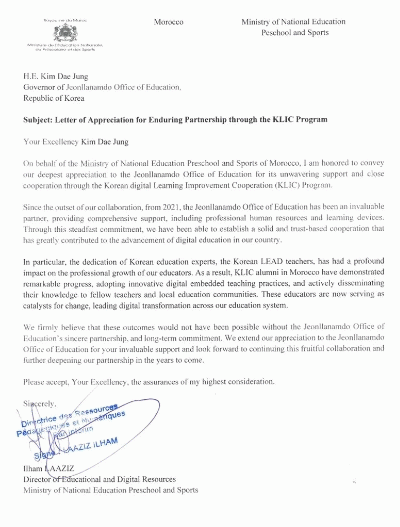 À̹ø °¨»ç ¼ÇÑÀº Àü¶ó³²µµ±³À°Ã»ÀÌ 2021³âºÎÅÍ ±³À° Á¤º¸È Áö¿ø »ç¾÷ (KLIC¡¤Korean Digital-Learning Improvement Cooperation)À» ÅëÇØ ¸ð·ÎÄÚ ±³À°ºÎ¿Í µðÁöÅÐ ±³À° ºÐ¾ß¿¡¼ Áö¼ÓÀûÀÎ Çù·ÂÀ» À̾î¿Â µ¥ ´ëÇÑ Æò°¡¸¦ ´ã°í ÀÖ´Ù.