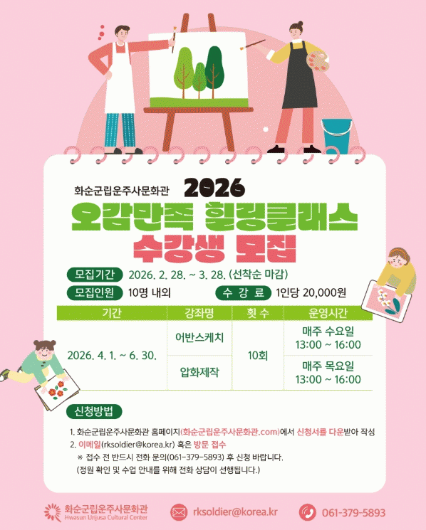 ¸ðÁý ÀοøÀº ¾î¹Ý½ºÄÉÄ¡, ¾ÐÈ Á¦ÀÛ µÎ °úÁ¤¿¡¼ °¢°¢ 10¸í ³»¿Ü·Î ¼±Âø¼ø Á¢¼ö·Î ¸¶°¨Çϸç, ¼ö°·á´Â 1Àδç 20,000¿øÀÌ´Ù.