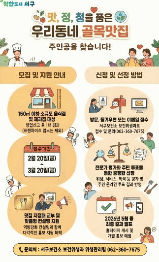 ¿ÃÇØ´Â ¼±¸ °ü³» ¼Ò±Ô¸ð À½½ÄÁ¡°ú Á¦°úÁ¡À» ´ë»óÀ¸·Î ÁøÇàµÇ¸ç ¼·ù ½É»ç¿Í ÇöÀå Á¶»ç, ¿Â¶óÀÎ ÁֹΠÅõÇ¥, Àü¹®°¡ ½ÉÀǸ¦ °ÅÃÄ À§»ý¡¤¸À¡¤¼ºñ½º¡¤ÇâÅ伺 µîÀ» Á¾ÇÕ Æò°¡ÇØ ÃÖÁ¾ 16°³¼Ò ³»¿Ü¸¦ ¼±Á¤ÇÒ °èȹÀÌ´Ù.