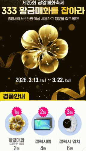 ¡®È²±Ý¸ÅÈ­¡¤¸Å½Ç GET¡¯ À̺¥Æ®´Â ÃàÁ¦ ±â°£ Áö¿ª ³» ÀÌ¿ë ¿µ¼öÁõ(ÇÕ°è 5¸¸ ¿ø ÀÌ»ó)À» ¼ÒÁöÇÑ ¹æ¹®°´ÀÌ¸é ´©±¸³ª Âü¿©ÇÒ ¼ö ÀÖ´Ù.