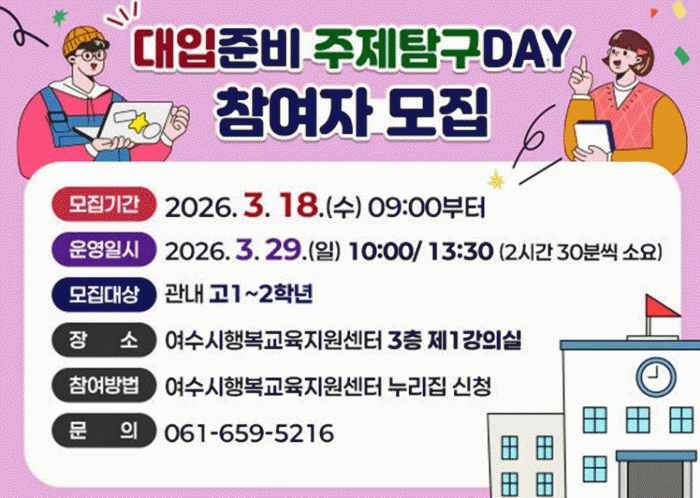 Âü¿©¸¦ Èñ¸ÁÇÏ´Â ÇлýÀº ¿©¼ö½ÃÇູ±³À°Áö¿ø¼¾ÅÍ ´©¸®Áý¿¡¼ »çÀü ½Åû ÈÄ Âü¿©ÇÒ ¼ö ÀÖÀ¸¸ç Âü¿© Çлý¿¡°Ô´Â ÁÖÁ¦Å½±¸ °¡À̵å ÀÚ·á µîÀÌ Á¦°øµÈ´Ù.